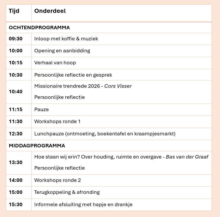 Tijdens het symposium kun je diverse workshops volgen. Daarnaast kun je je laten inspireren op de Missionaire Markt. Op deze markt delen verschillende organisaties en initiatieven over hun activiteiten. Meer informatie over de workshops en de missionaire markt vind je hier.